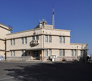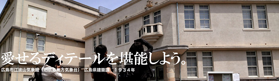 | このコーナーでは広島の建物をアーキウォークのメンバーで訪問し、私たちなりの視点でご紹介したいと思います! 記念すべき第1回で取り上げるのは江波山気象館です。広島デルタの南端部、江波山に建つ古い気象台であり、今は博物館として一般公開されています。 まずは外観を見てみましょう(右の写真)。窓が縦長なのが分かりますね。昔の西欧の建物はレンガ造りが多く、横長の窓を作るとそこからレンガが崩れてしまうので、窓は伝統的に縦長でした。この建物はレンガではなく鉄筋コンクリートなので横長の窓もできるはずですが、これまでの慣例にのっとって縦長にしているのだと思います。 また、全体的に丸みを帯びたやわらかい印象を受けます。こういったスタイルは一般に「表現主義」と呼ばれ、戦前はこういった丸みを帯びたかわいい建物が多くありました。全国を見回すとまだまだ残っているものの、広島ではこれくらいしかありません。それだけ貴重な建物なのです。 |