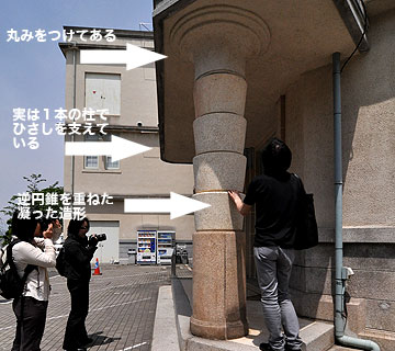 | アーキウォークのスタッフたちがいきなり食いついている(右の写真)のが、入口のヒサシとそれを支える柱です。普通に円筒形にしてもよさそうなところを、わざわざ逆円錐を重ねた凝った形にしてあります。 もう一点注目すべきは、柱が1本しかなく、一見して不安定そうに見えることです。鉄筋コンクリートならばある程度支え無しで出っ張る(「片持ち」「キャンチ」といいます)ことができるので、建築家はあえて柱を1本にして意外性を出すと共に、レンガとは違う鉄筋コンクリートという建材の可能性を試してみたかったのでしょう。 建築を見る醍醐味は、このように細部(ディテール)に込められた「作り手」の気持ちを感じ取り、空間を通して「作り手」と対話できることだと思います。 |