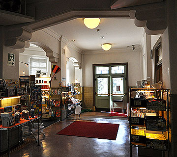 | 室内もやわらかい印象です。柱と梁(はり)の接続部分には雲みたいなクネクネした飾りがついています。どことなく、和風建築の”組み物”を思わせますね。 ※写真を撮る時には、他の来館者の迷惑とならないように十分注意してください。 |