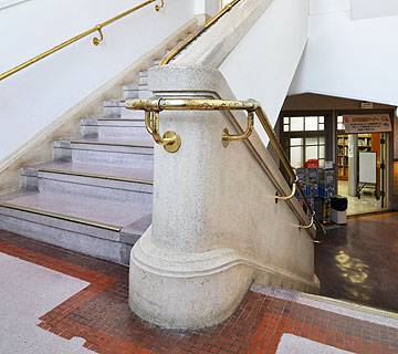 | 階段の手すりや床にも注目してみましょう。 この石のような風合いの仕上げは「人造石研ぎ出し仕上げ」と呼ばれます。これはモルタルに石を混ぜて一度固めてから職人が削って磨き上げていくという方法であり、手間がかかります。 日本の昔の建物は、洋館であっても江戸時代以来の伝統の職人技が随所に見られ、多くの建物が工芸品というべき美しさを備えています。現代は当時と比べて人件費がずっと高額になりましたので、手作業を多用するのは難しく、だからこそ昔の建物の細部(ディテール)は見どころ満載です! |