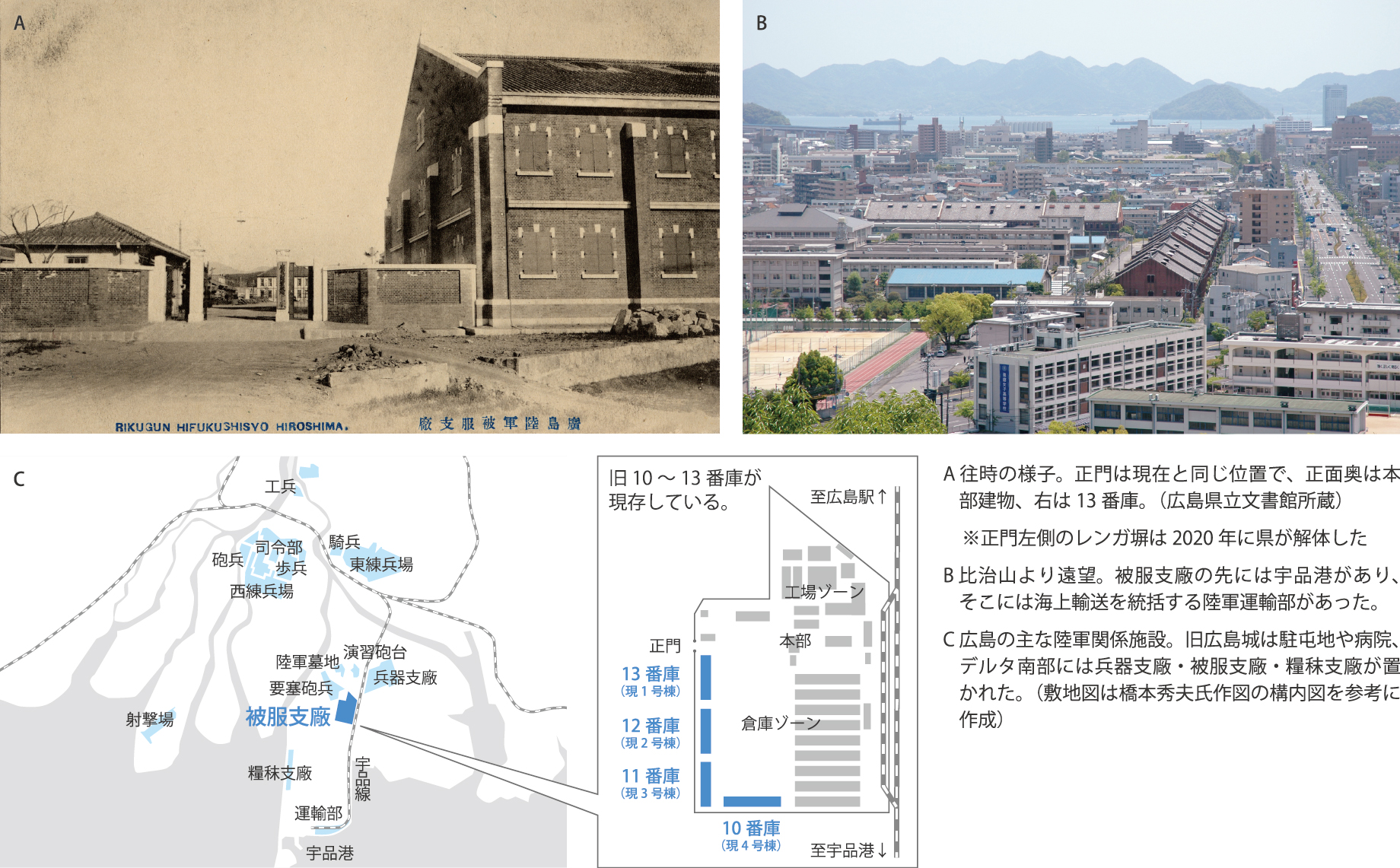 地方都市である広島が近代化を遂げるきっかけとなったのは宇品の築港・干拓事業でした。築港直後の1894年に日清戦争が勃発すると港への鉄道が敷設され、広島城には大本営や帝国議会が移転。こうして臨時の首都となった広島は戦争遂行の拠点となります。1904年には宇品に陸軍運輸部が置かれて物資輸送の一大拠点となったこともあり、周辺には巨大な三つの軍需工場(兵器支廠・被服支廠・糧秣支廠)が建設され、軍需は広島の地域経済にとって欠かせない原動力の一つとなっていきました。