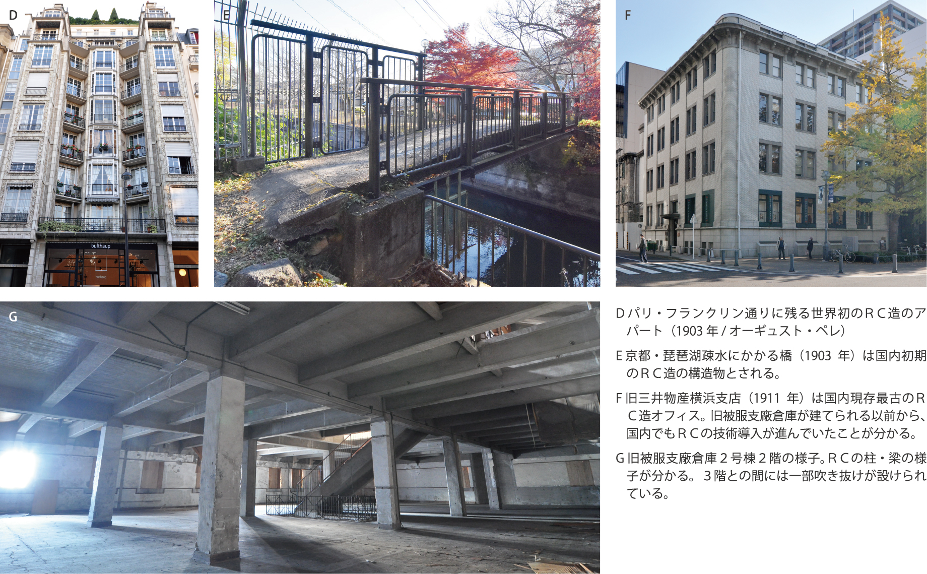 日本でも比較的早期にこの新技術の導入がはかられており、1903年には京都の琵琶湖疎水にRC造の橋が架けられています。国内に現存する初期のRC造建築としては、旧三井物産横浜支店(1911年)や小野田セメント工場建屋(1911年)があり、いずれも被服支廠倉庫より若干古いものです。国内初のRC造アパートは軍艦島として有名な端島の30号棟(1916年)とされます。