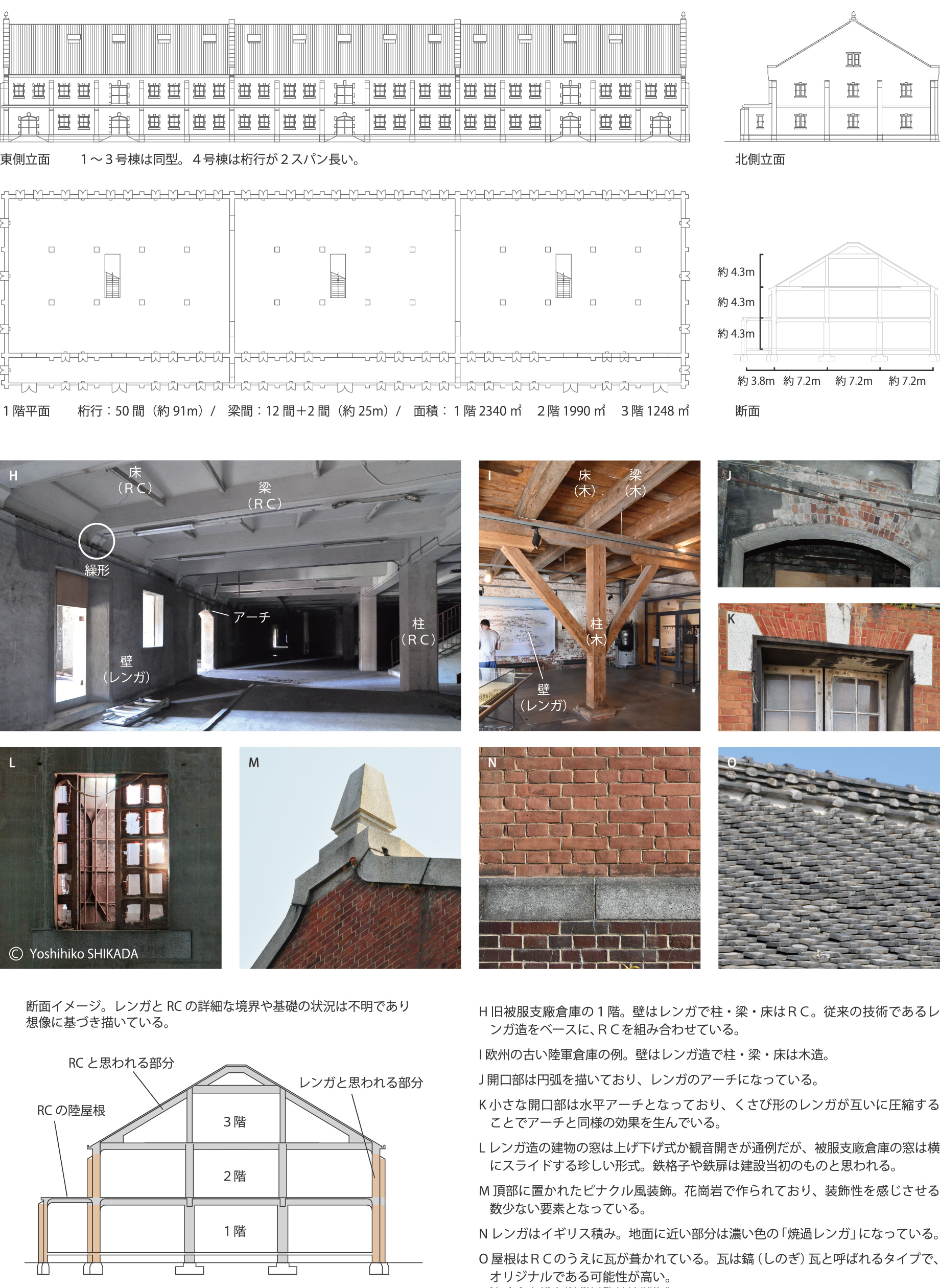 倉庫の設計を担当したのは当時の状況から陸軍第五師団の技師と思われますが、裏付ける資料はなく(※)、推測の域を出るものではありません。また、陸軍は同時期に全国各地にレンガ造の倉庫を建てていますが、RCを使った例は他に確認できません(※)。被服支廠倉庫の場合、不燃性や大空間の確保を狙って実験的にRCを採用したと推察されますが、詳しい理由は不明です。