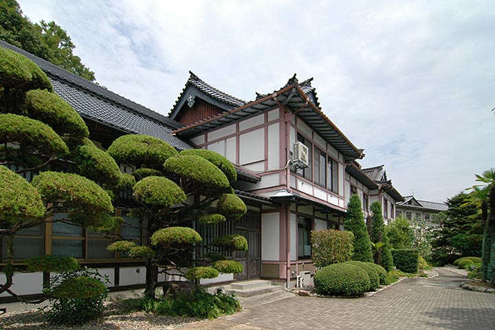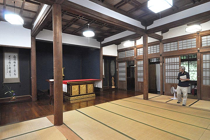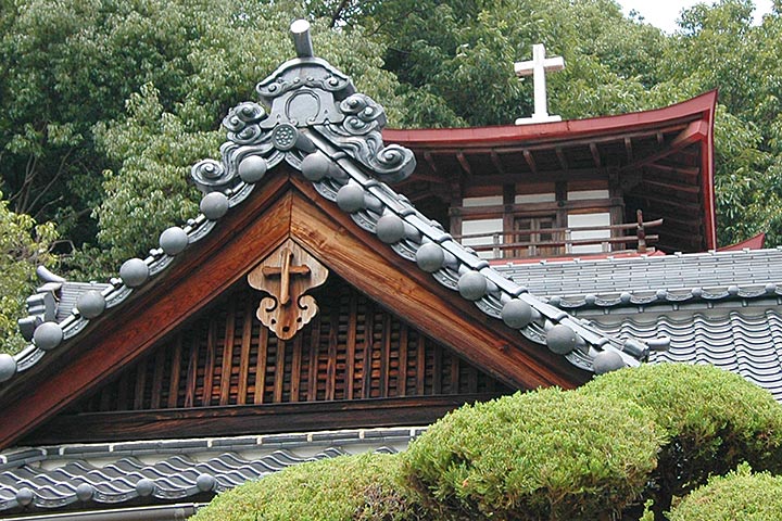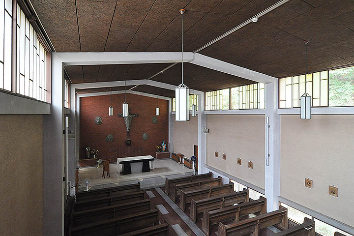 | 広島の被爆建物の中でもユニークな作品が長束にある。イエズス会という修道会の修道院で、当初は「修練院」といい、神父や修道士になる初期養成を担う施設だった。被爆時の爆風は中心部から離れたこの地にも襲いかかり、本作もガラスが飛び柱が折れたという。当時の院長だったアルペ神父は建物を開放して負傷者の救護にあたり、後に世界平和記念聖堂建立に奔走することになるラサール神父もここで治療を受けている。 本作最大の特徴は、カトリック修道院なのに和風で統一されている点だ。木造の外観はいかにも和風で、入母屋の屋根には和瓦、舟肘木も見える。そして懸魚や仏塔っぽい鐘楼には十字架が付いている。室内の聖堂は書院風で、畳敷きに吹寄せ格天井、内陣には床の間まである。だが、完全に和風というわけでもなく、左右対称で両翼が張り出す建物形状、小屋組のトラス、緩やかな階段などは洋館に由来するし、個室はイスやベッドの生活を前提としている。外国人を意識したか天井も高い。これら特徴から、本作は近代和風建築に分類できると思う。 設計者は不明ながら、イエズス会の施設を一手に担っていたドイツ人修道士の関与が濃厚だ。しかし、外国人にこれほど和風らしい和風ができるかは疑問で、建物の基本形状以外は日本人大工に任せたのではと推測している。 【注意】聖堂は信仰の場として開かれていますが、建物見学のみの訪問はご遠慮ください。 |