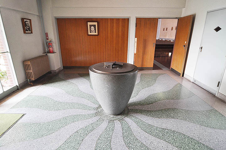 | 「広島の建築の特徴は?」と聞かれたら「戦後復興期のモダニズムです」と答えるようにしている。木造の逸品のほぼ全てを戦災で失った広島ではどうしても復興モノが中心となり、丹下・村野という巨匠の作品が目立つが、実は同時期に建てられた隠れた名品も多い。 広島学院の校内に建つ古江修道院もその一つ。解体が予定されているためアーキウォークの主催で見学会を行い、参加者と一緒に内部を見て回った。 まずは外観から。本作はデザインの異なる聖堂と修道院が連結されている。聖堂は横連窓に引戸で和風を感じさせ、ピロティを持つなどモダニズムらしい姿。修道院は一転して壁主体の保守的なスタイル。注目点は修道院の窓で、観音開きではなく上げ下げ式が2つ並び田の字になっている。かつて30人近くいたという外国人司祭・修道士向けの仕様なのだろうが、日本人の発案とは考えにくく、イエズス会施設を多く監修したドイツ人建築家が関与したと推測している。 ディテールも決して華美ではないが、丁寧な仕上げによる凛とした美しさや暖かみが印象的。特に洗礼盤周辺の床は真鍮目地付き研出し仕上げで、天然石のような風合いがいい。スチールの建具や木製家具も年月を経た深みを感じさせる。 解体は残念だが、せめてその姿を記録に留めることで広島の建築文化の隠れた一面に光をあてることも、アーキウォークの役割だと思っている。 |