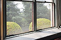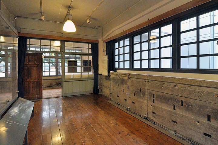 | 建物を見るポイントの一つに窓がある。戦前期の大建築である旧日銀広島支店、福屋、旧産業奨励館(原爆ドーム)の窓は縦に長いが、これらは縦長窓を基調とする西欧の様式の影響だろう。一方、モダニズム建築の旗手である建築家ル・コルビュジェは、技術の発達で横長窓(水平連続窓)が可能になると「サヴォア邸」などで採用し、日本の建築家たちも後に続いた。こうして平和記念資料館や広島県庁など戦後復興期のモダニズム建築は横長の窓を強調している。 では戦前期の建物に横長窓を持つモダニズム建築がないかというと、実はある。現存する中でもっとも分かりやすいのは袋町小学校だろう。校舎の大半は解体されたが一部が平和資料館として保存され見学できる。外観を見ると、他の被爆建物とは異なり、居室の横長の窓と階段室の大きな縦長の窓が印象的で、窓には水平・垂直を強調するリブが入っている。室内もシンプルなつくりだが、階段室での端部を丸める処理などは柔らかい印象を与える。水洗トイレやダストシュートなど設備面も充実していたという。1930年代当時の最先端だったモダニズムを理解したデザインであることは間違いなく、当時の市役所の高い設計能力をうかがわせる。 室内は被爆直後の状況を伝える方針で保存修復され、炭化した木レンガを間近に見られるなど、きれいに修復された他の被爆建物にはない重要な役割を担っている。 |
