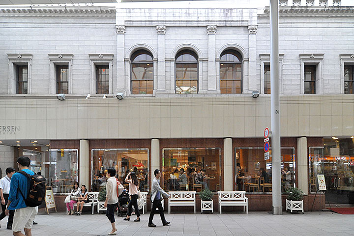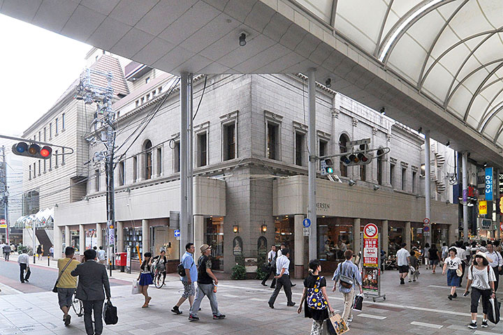 | いわずと知れた、本通りのシンボル。周囲は安っぽい商業建築でも、この店の前を歩くときだけは凛とした気持ちになる。ローマ以来の悠久の歴史を背景とする様式建築の奥深さがそうさせているのだろう。そして、本通りに残る最後の被爆建築でもある。 この建物は三井銀行として、旧日銀と同じく長野宇平治の設計で建てられた。装飾が少なく左右対称、正円アーチ、矩形(四角形)窓、さらに横ラインがしっかり表現され、ネオ・ルネサンスと判定できる。ただ、被爆による損傷からの復旧に加え、銀行から店舗に変える際にも改造されており、様式建築の華であるファサードの柱やバルコニーは撤去され、ちょっと物足りない外観になってしまった。 この店は日本におけるベーカリー複合店舗の先駆けであり、客が自らケースからパンを取る方式はここが発祥であるなど、ストーリーは豊富だ。広島という地方都市に北欧の生活スタイルを紹介した役割も大きく、館内にはデンマークの名誉領事館となっている部屋もある。 こういった欧州らしい洗練されたブランドイメージは、様式建築だからこそ保たれていると思う(東京青山の支店にこれほどの風格はない)。本作も老朽化による解体話が出ているが、せめて外壁だけでも保存して、本通りの上品で華やかな一面が後世に残ることを願いたい。さらに失われた列柱が復元されるといいのだが、さすがにそれは贅沢だろうか。 |
