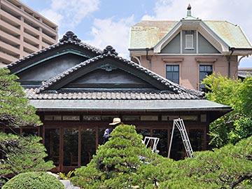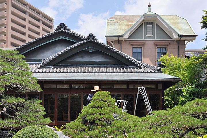 | 日本建築の華、それは木造の名品だ。日本の木造建築は、20世紀前半に絶頂期を迎えた以降は衰退し続けていて、当時の職人たちの緻密な細工の多くは現代では再現不可能という。東京で暮らしていると、そんなすばらしい木造建築が、減ったとはいえいくつも残されていることに気づく。一方で広島の中心部にあったはずの木造の名品は、被爆によりその全てを失っている。そこに、空襲を受けつつも「焼け残り」が生じた東京とは違う、広島の戦災の特殊性を見ることができる。 そんな広島にかろうじて残された戦前期の木造の中でも名品といえるのが三瀧荘だ。邸宅として建てられ、増築されながら料亭旅館に転じ、現在は結婚式場・レストランとなっている。洋館付きの主屋は、むくり屋根に銅板貼りの懸魚(げぎょ)が印象的で、内部は網代(あじろ)天井など数寄屋(すきや)のエレメントで飾り立てられている。戦後の増築部分は主屋とはスケールが異なるものの、同じく数寄屋であり統一感がある。このクラスの建物は確かに京都あたりにはいくらでもあるのだが、復興モダニズムの存在感が強い広島の地で木造を鑑賞できることに大きな意味があるし、結婚式場への改装時に手が加わったとはいえマンション開発されることなく生き残ってくれて本当に良かったと思う。 客としてなら中に入れるので、たまには豪華ランチがてら建物鑑賞に出かけてみてはいかがだろうか。 【注意】お店の営業の支障とならないよう配慮をお願いします。 |