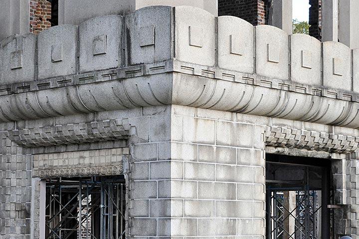 | 広島に残る被爆建物の中でも、内装を含めて往時の姿をとどめつつ現役で使われている希少な建物の一つが広大附属の講堂だ。旧制広島高校講堂として建てられ、後に平和記念資料館を設計する建築家丹下健三もここで入学式を迎えたはずである。 まず外観から。無装飾のモダニズム建築が普及しつつあった昭和初期なのでゴテゴテした装飾はないが、学舎にふさわしい風格を求めたのか、欧州の様式建築のように外壁に沿って列柱を付けている。この柱は2層ぶちぬきのジャイアントオーダーで、柱の上、様式建築のアーキトレーブに相当する箇所には装飾されたタイルが並び、彩りを添えている。さらに外壁は全体的に洗出し仕上げで、石造りのように見せている。 室内もかなりおもしろい。こちらの列柱は円形で中央部が膨らむエンタシスとなっており、外観よりもさらにギリシャ神殿っぽい印象を受ける。2階席の張出しと様式建築由来の造形ともうまく共存しているし、玄関扉まわりの装飾やエントランスのモザイク装飾(2587とは建設年を皇紀で記したもの)も見ていて楽しい。当初あったはずの天井装飾が失われているのは残念だが、それでも各所に漆喰を用いた装飾が残っている。 こういった細部を鑑賞する楽しみのある被爆建物は残りわずかとなり、その希少性は増すばかりだ。ぜひ学校のシンボル・地域の宝物として大切に使い続けられることを願いたい。 【注意】普段は非公開です。 |