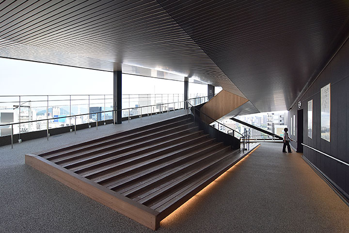 原爆ドームのすぐ背後に建つオフィスビル。もとは1978年に建てられた、いわゆる旧耐震基準の建物だったが、建て替えると景観規制の影響で床面積が減ってしまう。そこで壊さずに改修することになり、耐震補強を兼ねて東西にバルコニーや階段を増築、外壁は作り直し、さらに屋上を展望台として一般公開すべく大屋根が追加された。 ひろしまの丘と命名された屋上の展望台からは平和記念公園を一望でき、高所かつ屋外なので広島ならではの風の変化を体感することもできる。また、ヒノキ材で覆われた床はゆるく傾斜しており、空間に変化をつけ景色を見やすくするとともに風を感じやすくしている。屋上の下階には折り鶴をテーマにした体験ゾーンやギャラリー、1階には物産店やカフェが配された。オフィスフロアは非公開だが、ワーカー向けのバルコニーや自然換気へのこだわりなど、普通のオフィスにはない個性を持つ。 屋上は風を感じながら景色を眺めるという機能に純化され、そこにデザインが応えてレベルの高い空間が成立し、実際に多くの人がたたずんでいる。これまでの広島にはなかった空間体験をもたらしている。また、建物を壊さなくても改修でここまでできると全国に範を示した意義も大きい。ビルの効率が低下したとしても屋上を一般公開する、原爆ドームの横という立地にふさわしい機能を入れると決めたオーナーの見識こそがこの場を形作ったと言ってよいだろう。 ※屋上は有料にて一般公開 |