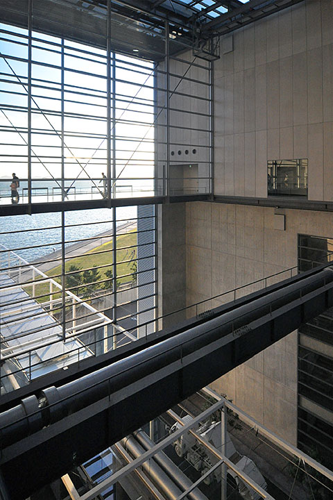 吉島通りを海に向かって進むと、その先端に巨大な箱があらわれる。これは広島市のゴミ処理場で、建築家谷口吉生が設計を担った。外観はあえて工場らしい形にして存在をアピールしつつ、内部に建物を貫く見学者向けガラス通路を設けている。このガラス通路はとてもスタイリッシュで、通路から眺める設備機器がアート作品に見えてくる。美術館設計を得意とする谷口の本領発揮というべき空間に仕上がっており、ゴミに対するネガティブなイメージが見事に払しょくされている。さらに通路を進むと先端の展望テラスから河口や海を見渡せ、ゴミというものが都市と自然の境界線上にあるのだと実感できる。 この建物は吉島通りによって平和記念公園と結ばれている。谷口は師匠である丹下健三(平和記念公園の設計で広島に都市軸を作り出した)を意識し、都市軸を建築に取り込む意図を込めて、ガラス通路を吉島通りの延長線上に置いた。立地の読み解きから来る明快な配置計画があり、細部の作り込みも徹底され、広島の特徴であるモダニズム建築の文化を受け継ぐ屈指の建築作品となっている。「世界一美しいゴミ処理場」と言ってもいいかもしれない。 駐車場完備でバス路線もあるので、まだ行ったことのない人はぜひ訪問してみてほしい。ガラス通路だけなら常時見学できるが(※)、できれば予約して工場内部も見学することをすすめる。空間デザインの力を感じることができるだろう。 ※夜間は閉鎖されている。予約先は市のホームページを参照。 |
