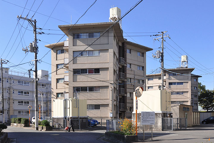 | 前回紹介した基町高層アパートの隣に広がるのが県営基町住宅。いかにも団地らしい板状住棟群に混じって、三方向に突き出した独特な形の建物がある。上から見るとY字型で星のように見えるので俗にスターハウスと呼ばれ、板状住棟が建てにくい敷地やアイストップとなる場所に建てられることが多い。1フロアあたり3戸が配され、3面採光も可能で通風採光に優れるとして人気を集めたという。 確かに、形が複雑でコスト高、北向き住戸が生じる、隣の住戸内が見えてしまう、家具を置きにくい…など、プランそのものが抱える課題は結構あるし、いずれも同じ設計図に基づいて効率重視で建てられたものであり、ディテールが特段豊かともいえない。だがこのフォルムの存在感はそんなものを超越した魅力がある。 さて、昭和30年代に集中して建てられたスターハウスは一斉に更新期を迎えていて、全国的に数を減らし続けている。このスターハウスも間もなく解体される予定であり、(私の知る限り)県内では福山の数棟を残すのみとなる。基町から牛田にかけての太田川沿いには、標準設計による住棟や高層アパート、公団の市街地住宅など多種多様な団地が並んでいるが、これから続々と解体されるのは間違いない。今のうちに目に焼き付けておいた方がよさそうだ。 [注意!] 現役の住宅であり、外観であっても不用意にカメラを向けることは控えてください。 |