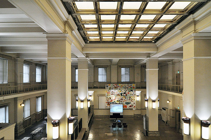 | 近代日本の建築家第一世代が辰野金吾なら、長野宇平治は第二世代にあたる。西欧の古典的な建築様式を完璧なまでに習得し、各地で多くの銀行を設計した(金融界は威厳あふれる歴史主義建築を特に好んだ)。東京の日銀本店は辰野だが、この広島支店のほか岡山や松江の支店も長野がデザインした。 歴史主義建築の見せ場であるファサードを真正面から鑑賞してみよう。タテヨコのバランスや窓の配置などには安定感があり、手堅くまとまっている。お約束のオーダー(列柱)やコーニスが付き、各所に装飾が見られ、いかにも西欧らしい形。だが装飾はゴテゴテしたものではなく、オーダーも薄い付柱に過ぎない。長野は同時期に同じくRC造の「大倉山記念館(横浜市)」で様式マニアぶりを炸裂させているのに、本作はなぜこれほど控えめなのか? モダニズムへ向かう世界的な流れに沿ったと解釈するのが妥当だと思うが、施主の意向や戦時体制という世相が影響したのかもしれない。 旧芸備銀行本店をはじめとする広島の歴史主義建築は戦後に続々と解体され、オリジナルに近い姿で残るのはついに本作だけとなった。外観は被爆建築とは思えないほどよく保たれているので、ぜひ室内装飾の失われた部分を復元し、被服支廠と共に広島の近代史を体感できる本物の"建築遺産"になってもらえればと思う。 |