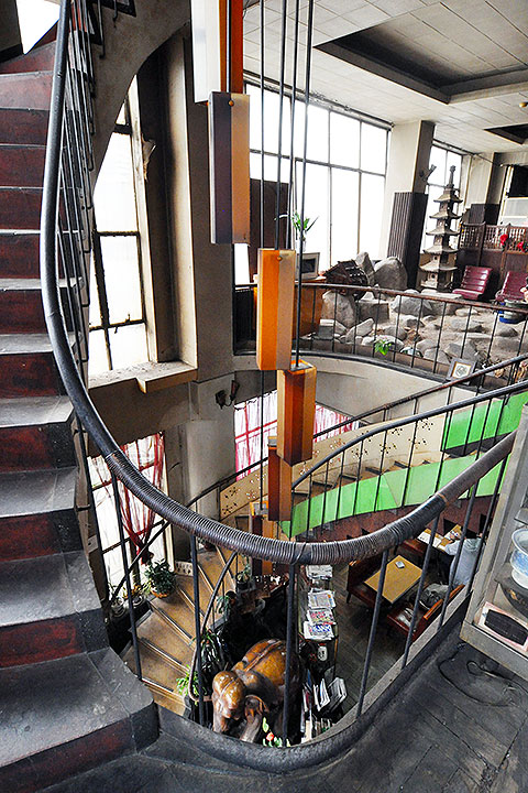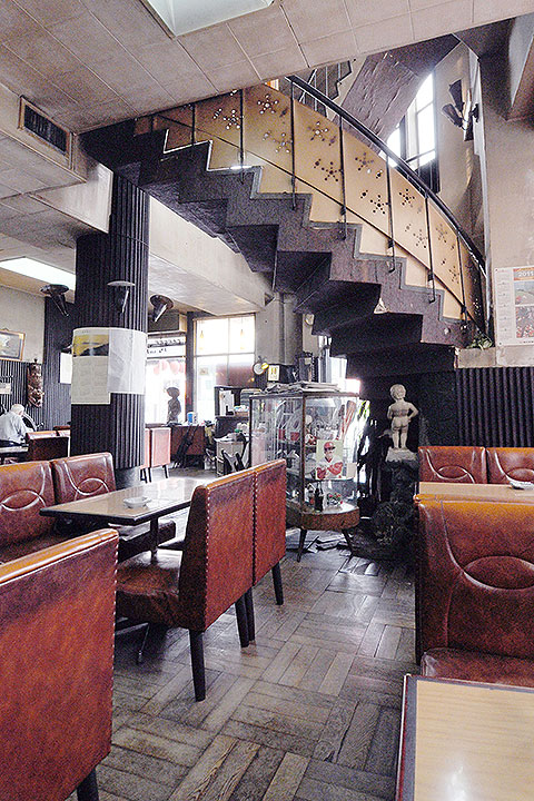| 広島駅前の電車通り沿いにパールという喫茶店がある。広電からよく見えるのでご存知の方も多いだろう。昔ながらの純喫茶というスタイルは、セルフサービス式カフェ全盛の現代では珍しい。 この建物が建ったのは昭和32年。戦災の傷痕を残しつつも、高度成長期に入り徐々に生活に余裕がでてきた時期だ。三階建てでモダンな構えの店はオープンするや大繁盛し、すぐに五階建てが増築された。以来、内外装ともほとんど姿を変えず現在に至っている。 手前の建物はいかにもモダンな横長の窓が特徴で、少し下へ傾斜しているのがおもしろい。内部には大きくカーブする階段があり、室内庭園のある二階へと導かれる。奥の増築部は縦長の窓を持ち、モダンから一転してややコンサバな印象を受けるが、これはこれで魅力的。細部では、窓枠やヒサシ部材などの鉄が良い味をだしている。 町場の商店建築らしいヘタウマな要素を多分に含んでいるものの、時間の経過と共に味わいが増し、言葉では表現しにくい独特の魅力(私はこれを地霊と呼ぶ)が宿っている。残念ながら、まもなく周辺の建物と共に再開発される予定になっているので、もし興味があれば早めに見に行くことをおすすめしたい。 |
