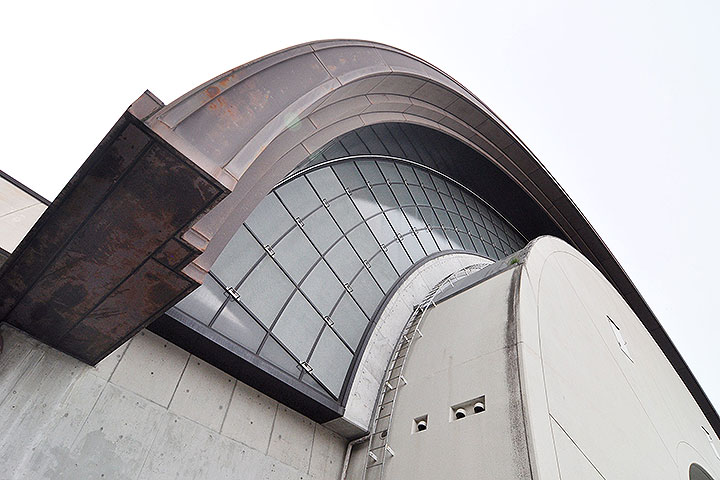 | いったいこの形をどう表現したらいいのだろう。巨大な円筒は某アニメに出てくるスペースコロニーを思わせるし、凹凸の具合はジェットエンジンのカウルのようにも見える。 この建物は広島市のスポーツ施設で、体育館とプールからなる。ガラス張りのプールの屋根はなんと可動式で、屋外プールにもできるよう設計されていた。バブリーだ、税金のムダだと騒ぐのは簡単だけど、たまにはこんな夢のある建築があってもいい。 円筒を半分に切った、蒲鉾のような形を建築の世界ではヴォールトという。力学的に安定したアーチをズラッと並べたのがヴォールトであり、単純な構造で大空間にできる利点がある。(ちなみにアーチをくるっと回転させたらドームになる) 建物全体をヴォールトにするという大胆な選択をしている一方、屋根をよく見るといくつか節目があり窓があけられているのに気付く。採光のためでもあるが、大ざっぱで野暮なデザインに陥らないよう工夫した跡だろう。 ヴォールトというシンプルな形を選びつつも、その造形を突き詰めることで、緊張感のある建築作品に仕上がっている。室内がいかにも公共施設っぽいのは残念だが、もしこの形にグッときたらぜひ見に行ってみてほしい。 |
