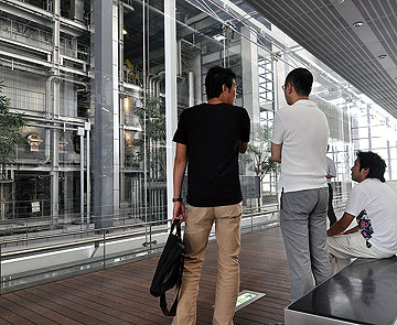 | ――まずは中工場について、建築家としてどういうところに注目しますか? 土井 谷口(吉生)さんということで、色んな細かなディテールが綺麗に収まっているんだろうなという目で見てしまう。 一同 そうだね。 吉田 細かいということでいうと、リバーサイドでステンレス手摺を使うにあたり、谷口さんの作風から行くとヘアライン仕上げが多いのだけど、防錆の為ここは鏡面っぽくしているらしいよ。外壁のリブの大きさなんかも大型建築ならではの選び方をしてる、通常より大き目のリブなので大きな面積で見ると繊細に見える。そういうスケールバランスはさすがだなって思う。 土井 ゴミ処理工場を、見学場所としてだけでなく、雑誌の撮影場所などに使われるのは、建築によるところが大きいね。(註:訪問した日、中工場で雑誌の撮影が行われていました) 平岡市長時代のピースアンドクリエイト事業にはやはり意義があって、清掃工場の設計を建築家に頼むということ自体が画期的だった。 |