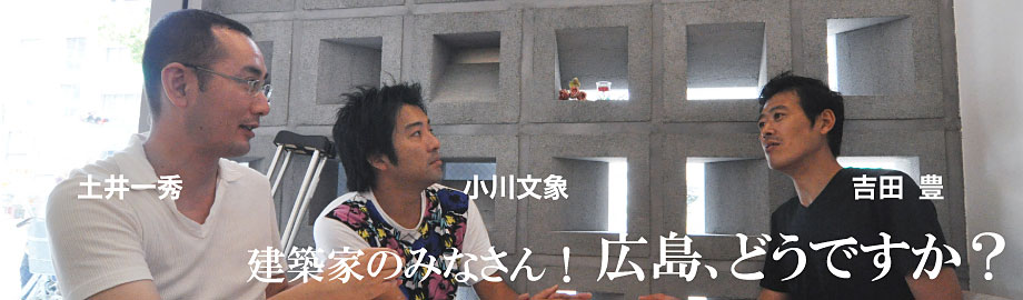 | ――広島を拠点に活動している建築家が、建築専門誌に特集されるなど、最近注目を浴びています。広島の建築家を取り巻く現状についてはどうお感じですか? 土井 確かに注目されている面はあるだろうけど、都市にインパクトを与えるにはほど遠いのが現状。例えばこのガイドブック(HIROSHIMA ARCHITECTURE)を見ても、広島の建築家の作品はごく少ない。作品の大半が個人住宅で、ガイドブックに載る、つまり公開できる建物は少ない。施主に喜ばれるものは作れているという自負はあるけど、街の人が誰でも知ってる施設に地元の建築家が関われていないのは残念なこと。 吉田 ガイドブックを見ると自分も関わった安佐南区総合福祉センターが載っているが、村上さんほどの建築家でさえ、公共建築が一つしか残せてない。 小川 業界内ではアツいと思うが、社会に打って出るところまで行っていないのが現状だろう。広島の建築に広島の建築家が関わる、つまり広島のアイデンティティが建築に埋め込まれていくことが自分にとっての理想。例えば公共系なら、公園の小さな設えや庁舎の外壁の色など、本当にちょっとしたことでも建築家に相談してもらえば必ずより良いものになる。 土井 たとえ予算が無くても、将来像は考え続けることが大切。そのためには、街の将来像について定期的にコンペを行い、案を買い取っていけばいい。ヨーロッパで仕事をしていた時に驚いたのは、実現を前提としないコンペが頻繁に行われていたこと。アイディアを出せるチャンスが頻繁にあることは、街にとって必ずプラスになる。 ――広島へのオリンピック招致を契機とした「Hiroshima 2020 Design Charrette」(略称:HODC)はアイディアを出すチャンスを自らつくろうという試みですね。今後、オリンピックだけでなく、紙屋町、駅前、基町、広島の街全体、どうしていくかということを、いろんな形でプランを出していくことは大事になってきそうです。 本日はどうもありがとうございました。 |