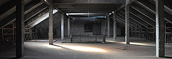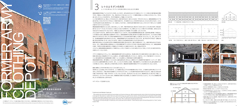 | <旧広島陸軍被服支廠倉庫(ひふくししょうそうこ)> 旧陸軍の軍服・軍靴等の貯蔵を目的に1913年に建てられた、4棟の赤レンガ倉庫群です。広島に現存する旧陸軍関係の遺構としては最大のものとなります。被爆時には、爆心地から距離があったこともあり倒壊は免れましたが、押し寄せる負傷者を収容する臨時救護所となり、その悲惨な状況は詩人峠三吉の文章などに残されています。 建築としての注目点は、レンガと鉄筋コンクリートの併用構造という大変珍しい形式である点、結果的にレトロな外観とモダンな室内が同居する空間構成、そして全国的にも現存例の少ない軍需工場の遺構という点があげられます。 戦後は様々な用途に使われ、1990年代までは民間企業が使用していましたが、現在は空き家となっています。