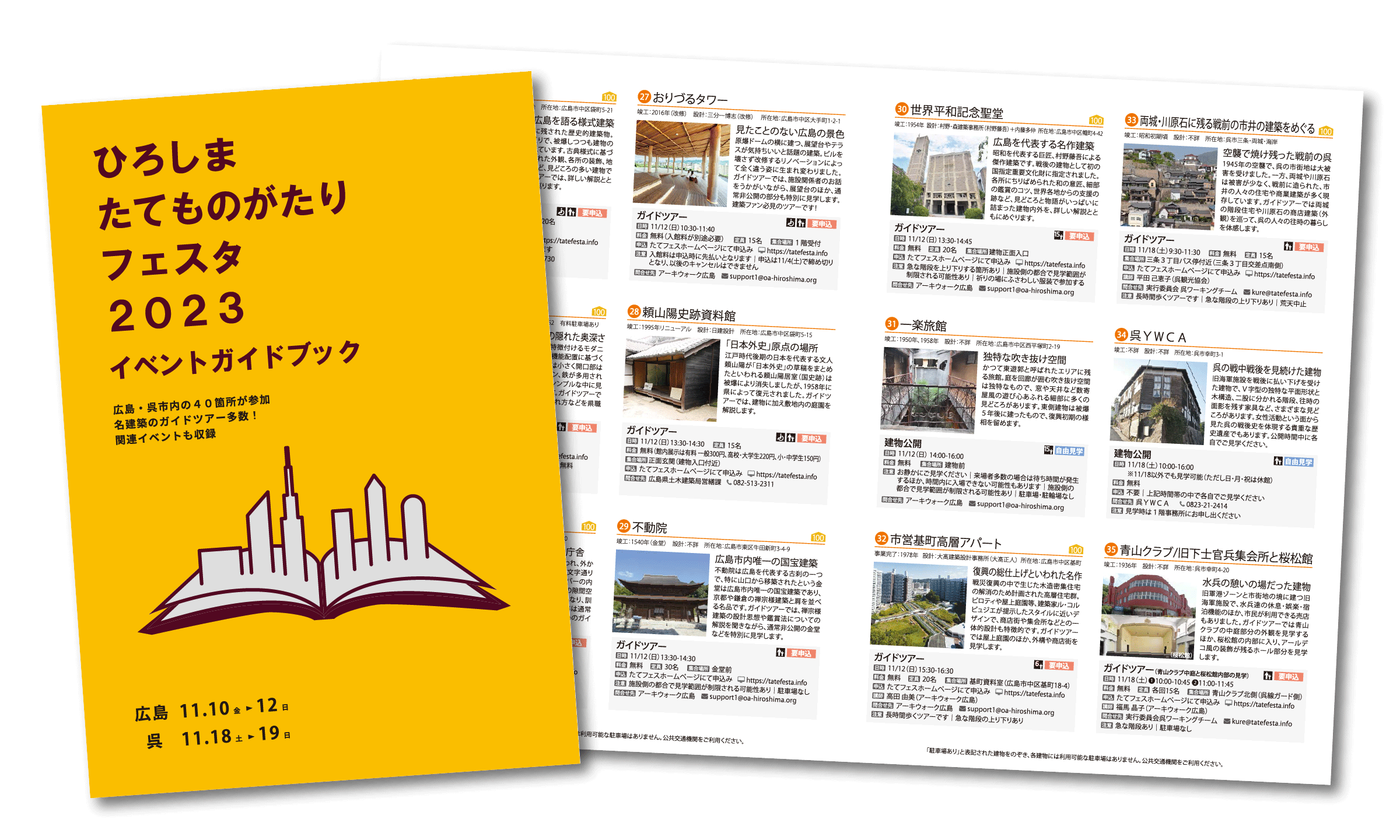 イベント全体のガイドブックを、ひろしまたてものがたりフェスタ実行委員会(主催者)が作成しています。公式ホームページからダウンロードできるほか、印刷されたものが県内各所で配布されます。(アーキウォーク広島以外の団体が主催するイベントも載っています)